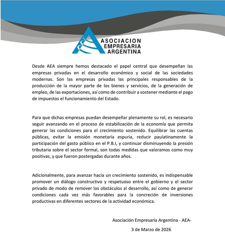 La Asociación Empresaria Argentina (AEA), cúpula del círculo rojo, cuestionó las formas del Gobierno y pidió “respeto”, pero lo hizo después de elogiar la política económica: “Equilibrar las cuentas públicas, evitar la emisión monetaria, reducir la participación del gasto público en el PBI y disminuir la presión tributaria sobre el sector formal son todas medidas que valoramos como muy positivas”, señalaron previamente en el mismo comunicado.