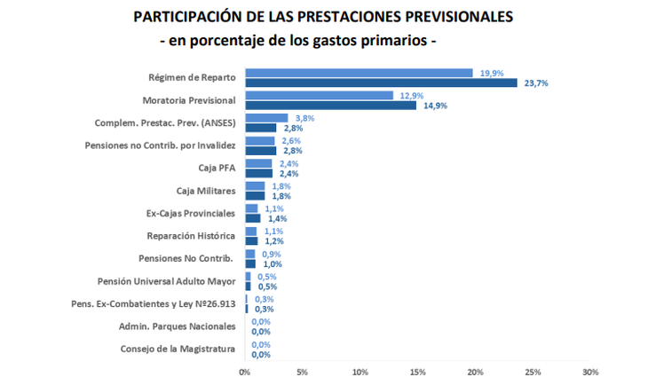 De acuerdo con un informe de la Asociación Argentina del Presupuesto y las Finanzas Públicas (ASAP), entre enero y noviembre el gasto en jubilaciones creció 8,8 puntos en relación al gasto primario. Pasó de representar el 36,6% del total a concentrar el 45,4%.