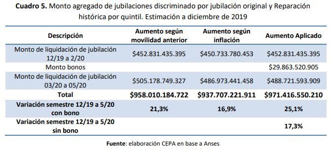 Según el informe, por cada $100 que cobraba en 2015, en 2019 un jubilado obtuvo aproximadamente $80,9. En los últimos cuatro años, el 40% de los beneficiarios con menores ingresos perdieron un 18% de ingresos en términos reales mientras que el 10% de mayores ingresos logró empatarle a la inflación. Esto se debió, en parte, a que el 70% de los recursos destinados a la Reparación Histórica fueron al 20% de las jubilaciones más altas mientras que el 40% de menores ingresos no percibió prácticamente nada.