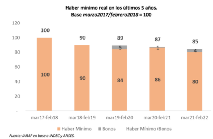 "En los últimos cuatro años, incluido el mes de febrero de 2022, la inflación promedio anual fue del 45,5%. La inflación sostenida en niveles altos evapora el poder adquisitivo de trabajadores activos y pasivos. Un análisis realizado para los jubilados que cobran el haber mínimo, incluyendo los bonos cobrados, permite afirmar que un jubilado que cobra la mínima perdió en el acumulado de los últimos cuatro años medio año de ingresos reales respecto a 2017", expresó Nadin Argañaraz, titular del organismo.