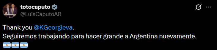 El tuit fue citado por el titular del Palacio de Hacienda, quien aseguró: "Seguiremos trabajando para hacer grande a Argentina nuevamente".