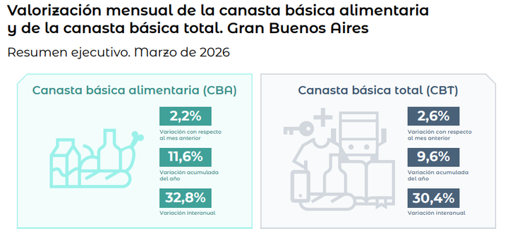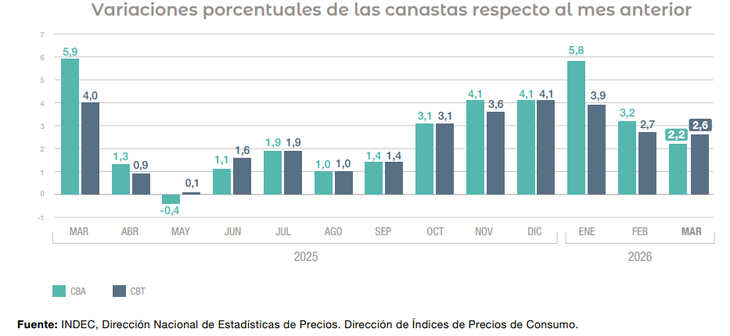 Con estos números, la inflación general del primer trimestre fue del 9,4%. En el mismo período, la CBT subió 9,6%, mientras que la CBA avanzó 11,6%.