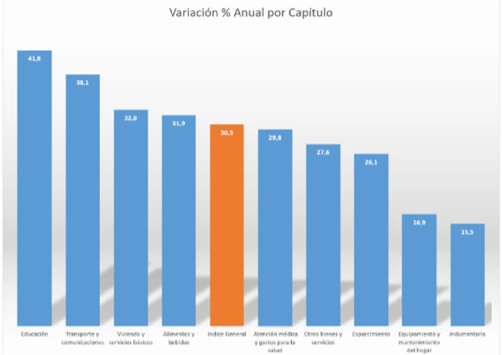 Al desagregar el comportamiento por rubros, Educación fue el capítulo con mayor incremento anual, al acumular una suba del 41,8%, traccionada principalmente por los aumentos en las cuotas de los colegios privados. En segundo lugar se ubicó Transporte y comunicaciones, con un avance del 38,1%.