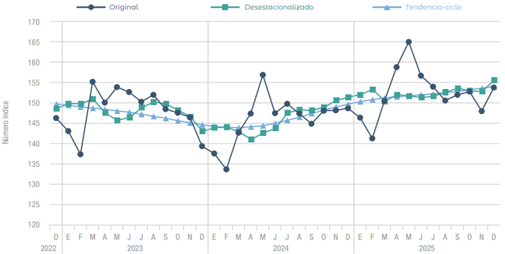 El INDEC informó este martes que el EMAE repuntó 1,8% en diciembre, versus noviembre, lo cual representó el mayor incremento mensual desde julio de 2024. De este modo, tanto la serie desestacionalizada como la tendencia-ciclo tocaron el valor más alto de la serie iniciada en 2004.