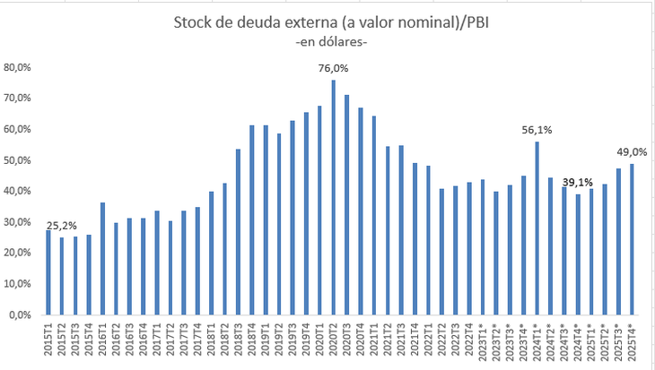 La deuda externa representó el 49% del Producto Bruto Interno (PBI) en el último trimestre de 2025. Esto implicó un incremento de casi 10 puntos porcentuales (p.p) en un año y la cifra más elevada desde el primer trimestre de 2024.