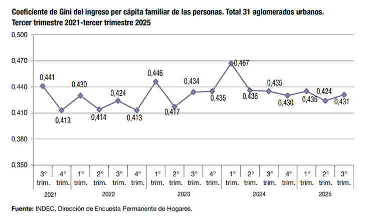 El coeficiente de Gini, que mide el nivel de desigualdad de la sociedad en base al ingreso per cápita de una persona, mostró una mejora y se ubicó en el 0,431, marcando así su valor más bajo en ese período desde 2022, cuando el indicador alcanzó el 0,424. Esto muestra una mejora en la distribución del ingreso, incluso mayor a la de 2023, previo al inicio del gobierno de Javier Milei.
