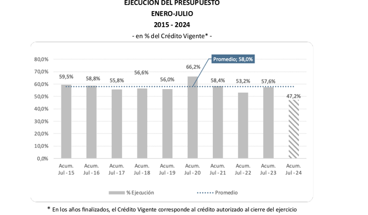 El reporte indica que, “con esta modificación, el porcentaje de ejecución del Presupuesto a julio de 2024 representa el nivel más bajo del periodo 2015-2023, diez puntos porcentuales por debajo de la ejecución promedio para el mismo período”.