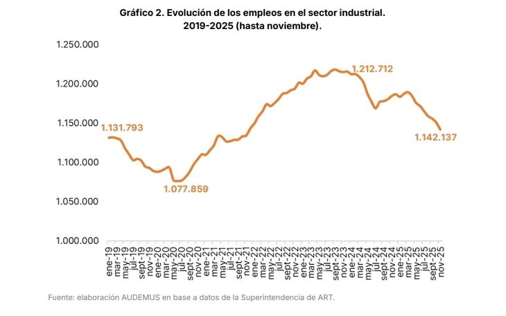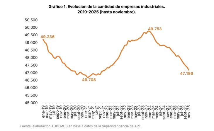 Los datos son alarmantes: el empleo sectorial cayó en 16 de los últimos 24 meses, se perdieron 73.000 puestos de trabajo y unas 2.400 empresas -equivalentes al 5% del total- dejaron de operar en los últimos dos años. Según Audemus, “la crisis actual está generando un daño sobre el entramado empresarial industrial comparable, o incluso superior, al de los episodios más disruptivos de las últimas décadas”.