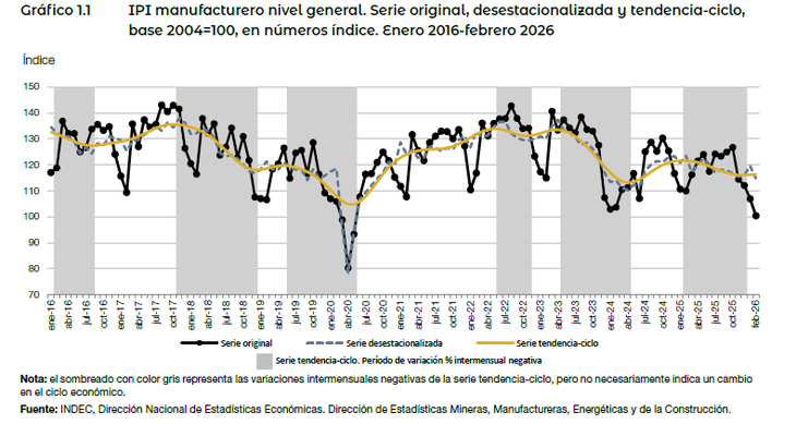 En el segundo mes de 2026, el índice de producción industrial manufacturero (IPI manufacturero) se derrumbó 8,7% respecto a igual mes de 2025. El acumulado del primer bimestre de 2026 se contrajo 6%, comparado a igual periodo del año pasado. Además, el índice de la serie desestacionalizada mostró una variación negativa de 4% respecto al mes anterior y el índice serie tendencia-ciclo marcó una variación positiva de 0,2% comparado con enero.
