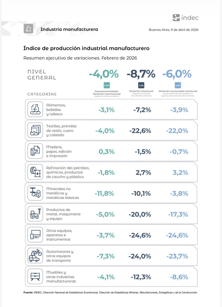 La industria se desplomó 8,7% respecto a igual mes de 2025. En el acumulado del primer bimestre de 2026 se contrajo 6%, respecto a igual periodo del año pasado.