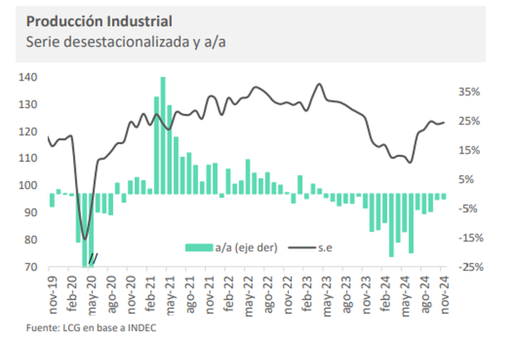 "Hay que tener en cuenta que el índice desestacionalizado están teniendo dificultades para recuperar el nivel de noviembre de 2023. En los últimos cuatro meses, tuvo un crecimiento marginal de apenas 0,9%", detalló la consultora LCG.