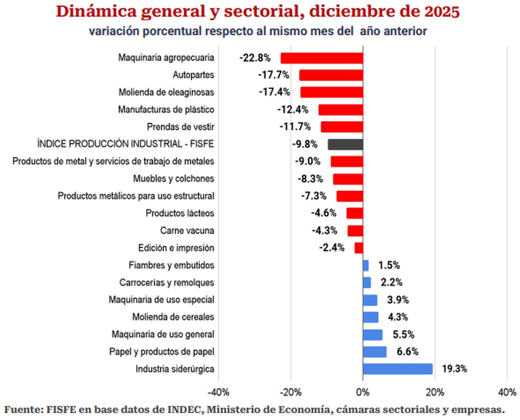 La industria santafesina se derrumbó 9,8% interanual en diciembre, mientras que en términos mensuales se contrajo un 3,9%. Sucedió pese a que en el acumulado de 2025 tuvo una mejora del 1,3%, explicada fundamentalmente por la muy baja base de comparación de los primeros meses de 2024, marcados por la devaluación y una fuerte caída del consumo.