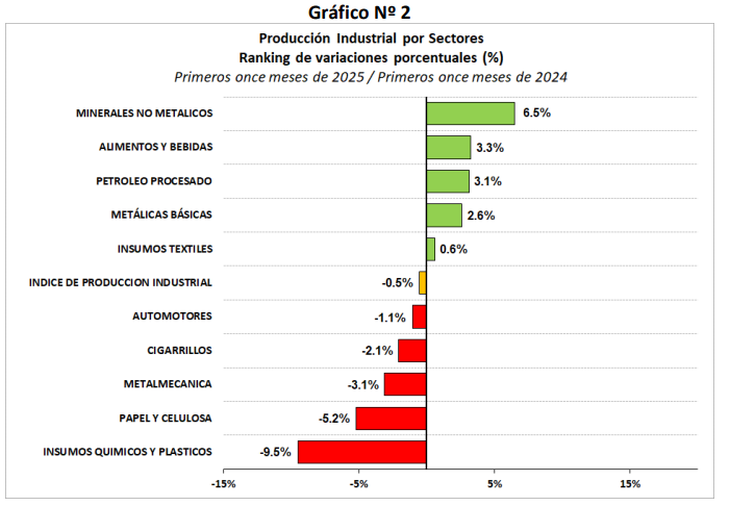 A nivel sectorial, las bajas más profundas de 2025 las sufrieron hasta el momento Insumos químicos y plásticos (-9,5%), Papel y celulosa (-5,2%) y Metalmecánica (-3,1%). Asimismo, las principales subas las arrojaron Minerales no metálicos (+6,5%), Alimentos y bebidas (+3,3%) y Petróleo procesado (+3,1%).