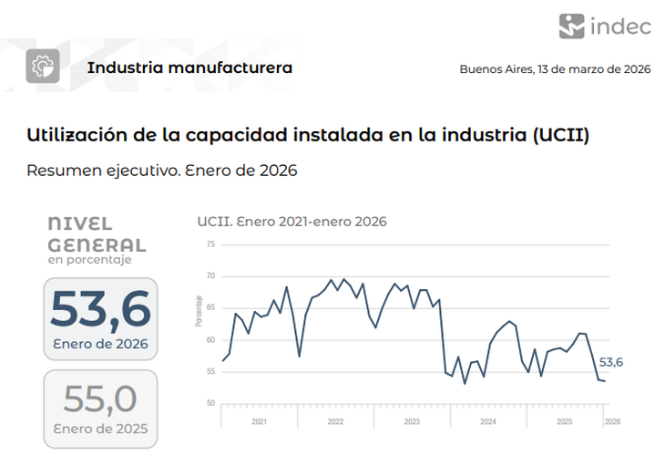 La industria manufacturera utilizó apenas el 53,6% de su capacidad instalada en enero. La cifra no solo fue menor a la del mismo mes de 2025, sino que representó el peor inicio de año para el sector desde la crisis de 2002.