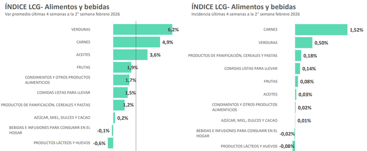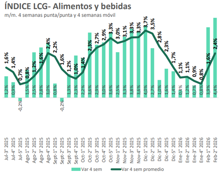 La inflación de alimentos y bebidas se aceleró al 2,4% en las últimas cuatro semanas. El principal impulso provino de las subas en carnes, producto que también lideró los aumentos de la segunda semana de febrero.