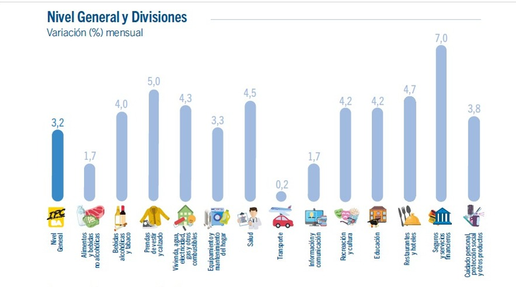 "La dinámica mensual de los Bienes respondió fundamentalmente a los incrementos en los precios de los alimentos (principalmente lácteos, carnes, panificados y gaseosas). En menor medida, se destacaron las subas en los valores de las prendas de vestir, de los libros, de los artículos para el cuidado personal y de los medicamentos. En tanto, el comportamiento de los Servicios", indicaron.