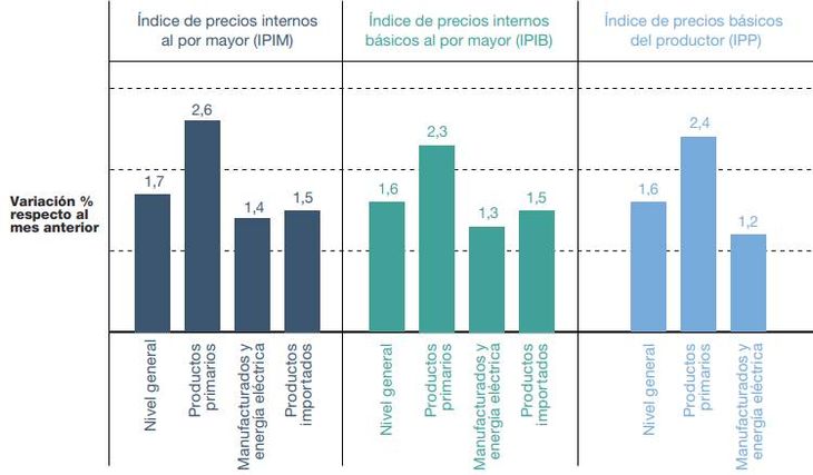 Este jueves, el Instituto de Estadísticas y Censos (Indec) informó que el Índice de precios internos al por mayor (IPIM) tuvo una variación del 1,7%. En tanto, el Índice de precios básicos al por mayor (IBIM), que excluye el efecto impositivo del IPIM, anotó un aumento de 1,6% y el Índice de precios básicos del productor (IPP) un alza de 1,6%.