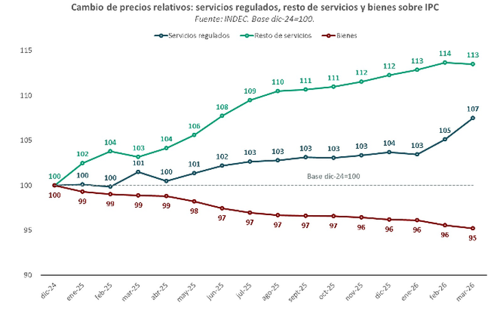 La inflación de servicios se aceleró con fuerza en marzo al ubicarse en el 4,2% mientras que la brecha contra los bienes se mantuvo alta (durante el mes pasado subieron 3%). Lo que sucedió fue que los servicios estuvieron impulsados por los fuertes ajustes tarifarios y marcaron su máximo avance desde diciembre del 2024. Entre enero y marzo, las tarifas de luz, gas, agua y transporte aumentaron un 13,4%, mientras que la inflación general fue del 9,4%. Asimismo, al interior de los servicios, los que más suben son los que afectan a los sectores más necesitados.