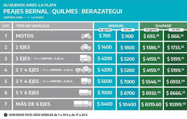Para el peaje de Villa Elisa, en sentido a La Plata, el costo para vehículos de dos ejes se fija en $1.100 si el pago es manual y fuera de hora pico, y en $1.300 en horario pico. Con TelePASE, el valor es de $1.037.60 en horario no pico y $1.296.99 en horario pico.