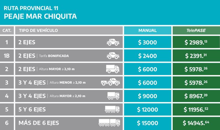 Sobre la Ruta Provincial 11, en el peaje de Mar Chiquita, la tarifa general para vehículos de dos ejes es de $3.000 de forma manual y $2.989.13 con TelePASE. Existe una tarifa bonificada para esta categoría de $2.400 manual y $2.391.31 con TelePASE.