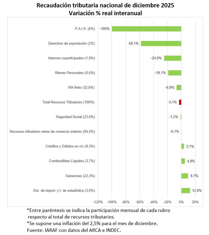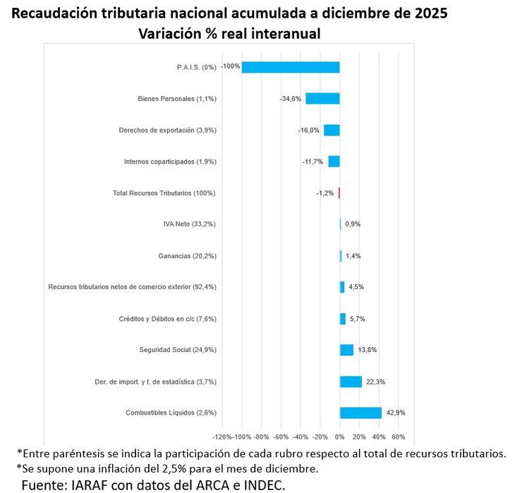 "En términos de variación real interanual, en el año 2025 los tributos con mayor caída (sin tener en cuenta la eliminación de impuesto PAIS) habrían sido Bienes Personales (-34,6%), derechos de exportación (-16%) e Internos coparticipados (-11,7%)", señaló el IARAF.