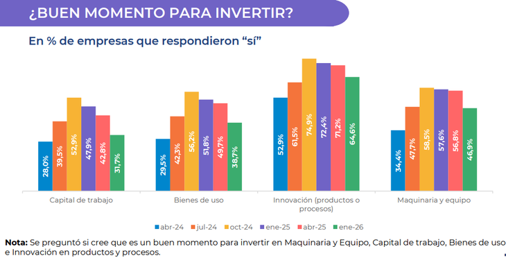 El reporte indica que la disposición a invertir es la segunda más baja desde abril de 2024. En ese momento solo el 34,4% de las firmas creía que era un buen momento para expandirse. En enero de 2025 el 57% pensaba que era buen momento para invertir y en enero de 2026 cayó a 46,9%.