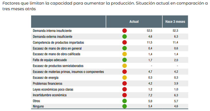 Para el 52,5% de los empresarios, la "demanda interna insuficiente" sigue siendo el factor que más limita la producción, una cifra muy similar a la de la encuesta anterior. Detrás le siguió, en orden de importancia, la "competencia de productos importados" , con un 11,5%.