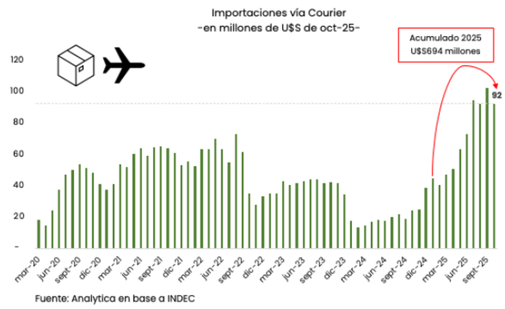 En el décimo mes del año, las compras de bienes despachados mediante servicios postales (courier), representaron unos u$s92 millones, 289,9% más que hace un año, aunque 11,2% menos que en septiembre. "Desde julio, el ingreso de bienes por esta vía se estabilizó alrededor de los u$s100 millones mensuales, aunque la dinámica del e-commerce sugiere que el techo todavía no está a la vista", señalaron desde la consultora Analytica.