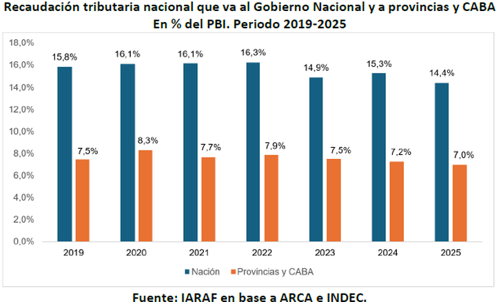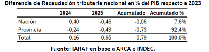El informe del IARAF logró estimar cómo se distribuyó el esfuerzo entre nación y provincias en relación a 2023. En 2024, la parte de la recaudación de impuestos que va a la Nación subió 0,4 puntos, mientras que en 2025 bajó 0,46, lo que dejó una baja acumulada de 0,06 puntos. En cambio, las de las provincias disminuyó en el primer año 0,24 puntos y 0,49 puntos en el segundo, lo que dejó una caída acumulada de 0,73 puntos.