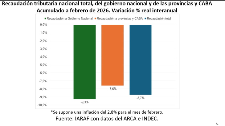 Según estimaciones del Instituto Argentino de Análisis Fiscal (IARAF), la recaudación que queda en manos de la Nación habría caído 9,3% real respecto del primer bimestre de 2025. En tanto, la porción que se dirige a las provincias bajó 7,6%.