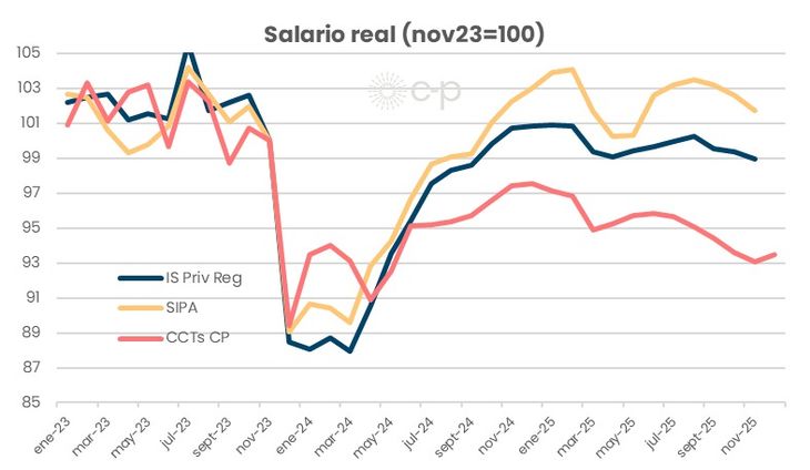 En diciembre, el promedio de las paritarias de los Convenios Colectivo de Trabajo que releva C-P registró un aumento real de 0,5% luego de cinco meses de caídas consecutivas. Este aumento se explicó por la suma fija acordada por el gremio de Comercio. Así y todo, en 2025 el salario de los CCT acumula una caída de 4,1% real.