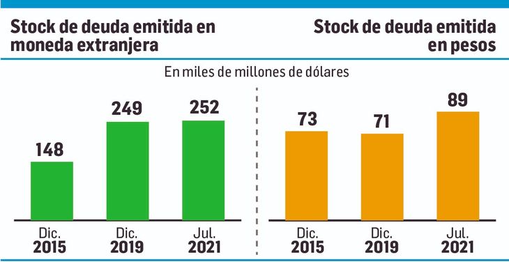 - Mezclan emisión de deuda denominada en dólares con emisión de deuda denominada en pesos: el actual gobierno emitió deuda en pesos, prácticamente no tomó dólares prestados.