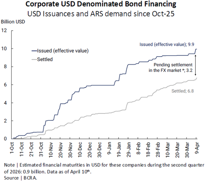 Esta merma en el principal factor de salida de divisas del sistema se da en paralelo a una mayor oferta. Según Werning, de las Obligaciones Negociables (ONs) emitidas por el sector privado, aún quedaban u$s3.200 millones por liquidar hasta la semana pasada.