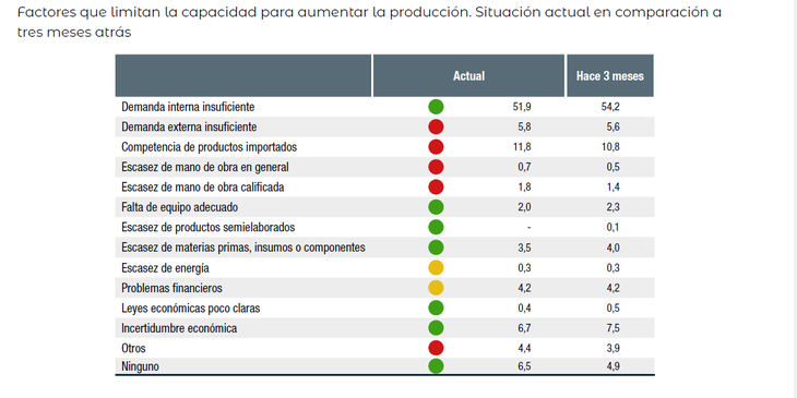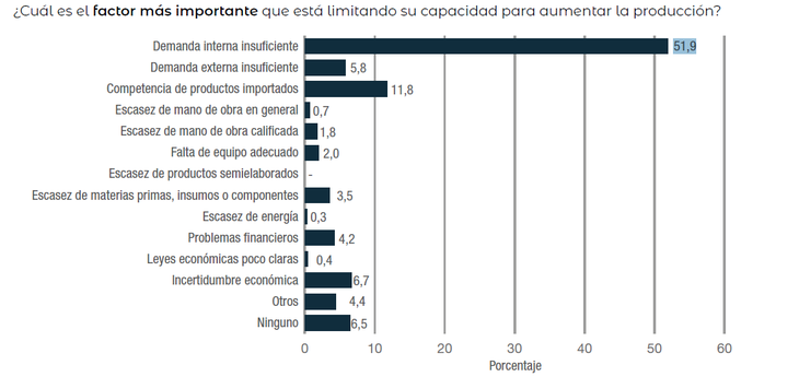La demanda interna insuficiente se despega por un amplísimo margen (51,9%) del resto de los factores que los empresarios industriales sostienen como causa del impedimento de acrecentar la producción, luego de ella se encuentra la competencia de productos importados con el 11,8%, y en tercer lugar la incertidumbre económica con el 6,7%.
