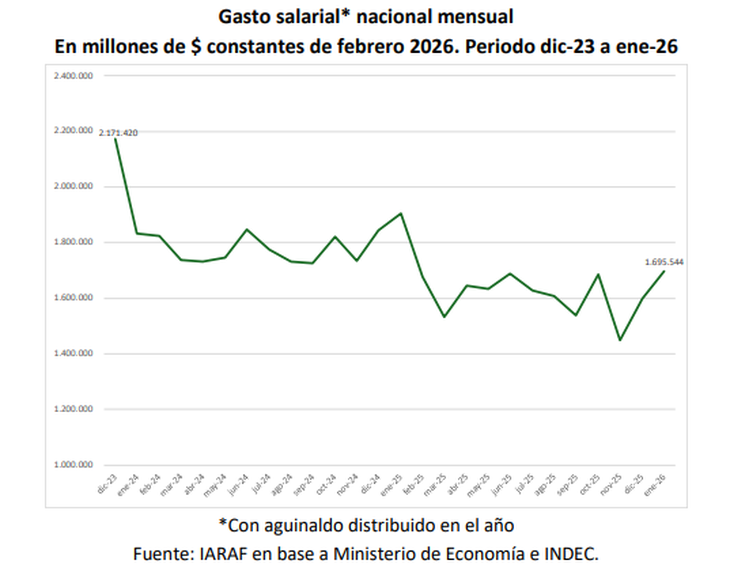 El informe indica que entre diciembre de 2023 y enero de 2026 hay una caída del gasto en salarios real del 22%. "En plata de febrero de este año, se pasó de un gasto mensual de $2,2 billones en diciembre de 2023 a uno de $1,7 billones en enero de 2026, según puede apreciarse en el gráfico 1. En efecto, la reducción mensual en este caso fue de $500.000 millones", indica el estudio. En pesos constantes, según indica el IARAF, la reducción acumulada fue de $11,6 billones y en dólares corrientes de U$S 10.700 millones.