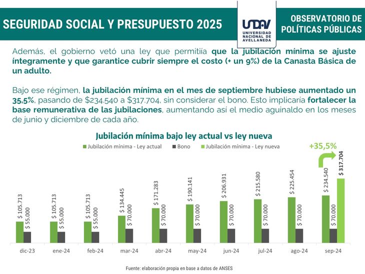 "En contextos de baja de inflación, como el actual, los haberes hubiesen aumentado y la mínima hoy sería de $253.074 -con fórmula vieja-. A futuro la diferencia se incrementará, lo cual podría generar litigiosidad contra la ANSES por parte de los jubilados", señalan desde UNDAV.