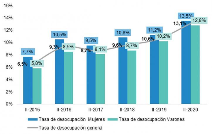 El índice de pobreza del primer semestre de 2020 fue del 40,9%. Cuando se observan los datos del mercado de trabajo, en el tercer trimestre del año pasado, la tasa de empleo fue del 37,4% con una brecha de género de 20 puntos en el caso de las personas mayores a 29 años: llegó a 85,6% y 61,8%, entre varones y mujeres respectivamente. En cuanto a la tasa de desempleo, se observa una tasa de 13,1% para las mujeres y de 10,6% para los varones. La tasa de desempleo más preocupante es en las mujeres jóvenes de 14 a 29 años, con un porcentaje de desocupación de 23%.