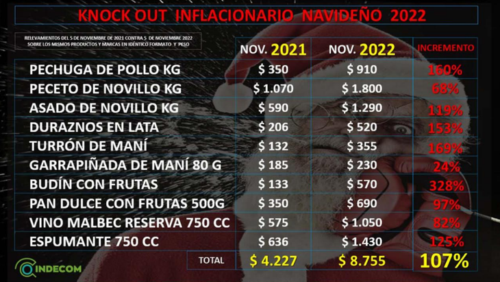 El estudio del Instituto de Estudios de Consumo Masivo (INDECOM) sobre los principales productos que se consumen para las fiestas de fin registró una suba de precios interanual que, en algunos casos, hasta triplica los valores de 2021.