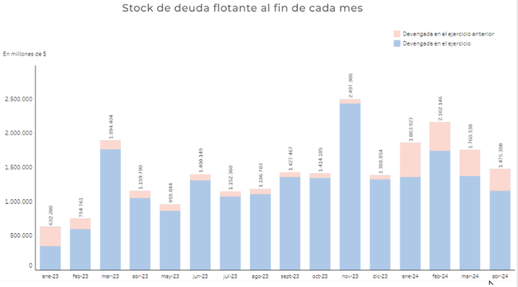 El monto de la deuda flotante de abril es el más bajo en lo que va de 2024 a valores corrientes y si bien en años anteriores pueden encontrarse meses con valores inferiores, la actualización por inflación deja en evidencia que el stock tuvo una reducción.