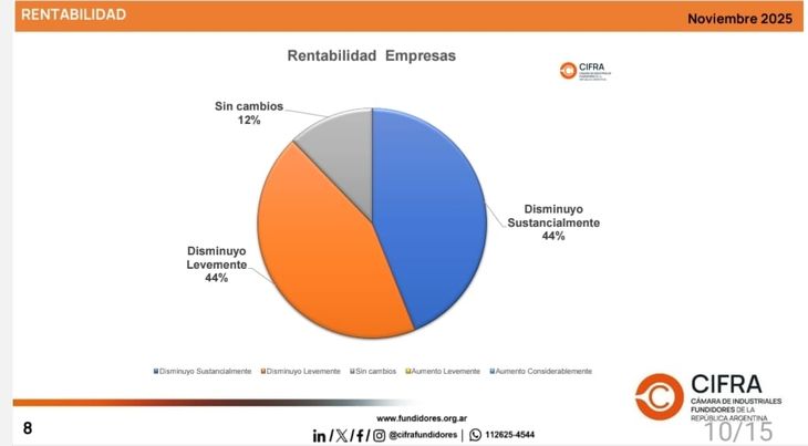 Otro eje preocupante del informe es la pérdida de rentabilidad. El 88% de las empresas industriales relevadas por la cámara de fundidores reportaron una caída en su rentabilidad. Ese universo de divide en partes iguales entre quienes señalaron una disminución sustancial (44% del total) y quienes indicaron una merma leve (44%). Solo el 12% sostuvo que el indicador se mantuvo sin cambios.