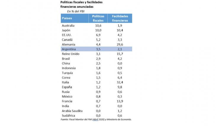 Al comparar el paquete argentino con lo que han hecho otros países, se destaca que “de acuerdo con datos del Fiscal Monitor del FMI (abril), en lo que se refiere a las políticas fiscales, la respuesta argentina se encuentra por encima de la de países como Brasil, China, Corea, Italia, España y Francia”.