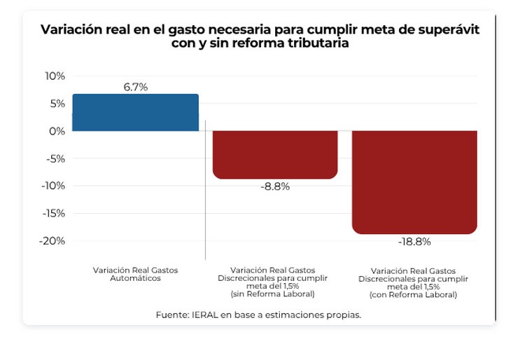 “Con una inflación esperada del 23%, esto implica que el gasto discrecional debería aumentar nominalmente sólo un 4% respecto de 2025”, agrega el informe. Incluso, sin aprobarse el capítulo tributario de la Modernización Laboral, el IERAL advierte que debería existir un recorte del 9% real en el gasto discrecional —equivalente a una suba nominal del 17%— para alcanzar en 2026 un superávit primario del 1,5% del PBI.