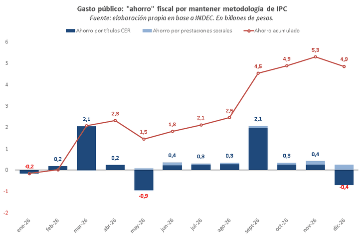 El cambio metodológico implica, según Estudios Económicos del Banco Provincia, que el Estado Nacional se ahorre casi $5 billones por la menor actualización de jubilaciones, pensiones y asignaciones que ajustan de manera automática por el último IPC, así como también los menores pagos asociados a los títulos públicos capitalizables por CER, que representan poco menos de 0,5% del PBI.