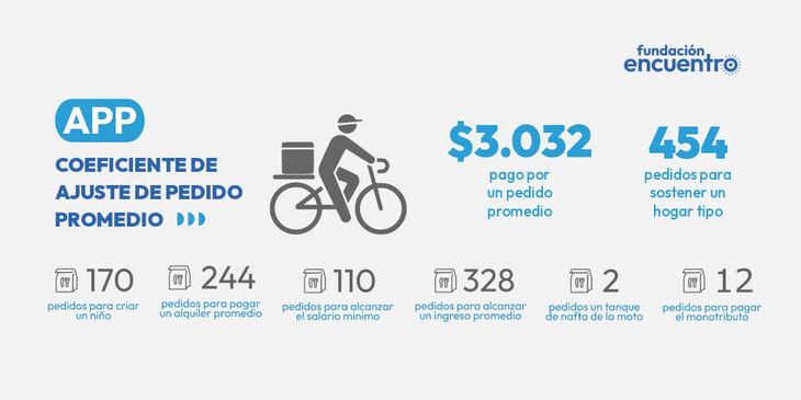Con un crecimiento desproporcionado de la oferta frente a la demanda, las comisiones se derrumbaron. Según el coeficiente de Alcance del Pedido Promedio, un indicador elaborado por la Fundación Encuentro que relaciona el valor que cobra un repartidor por un pedido con la canasta básica de un hogar tipo, un trabajador tiene que realizar 454 entregas mensuales para no caer bajo la línea de pobreza: unos quince repartos diarios, sin francos.