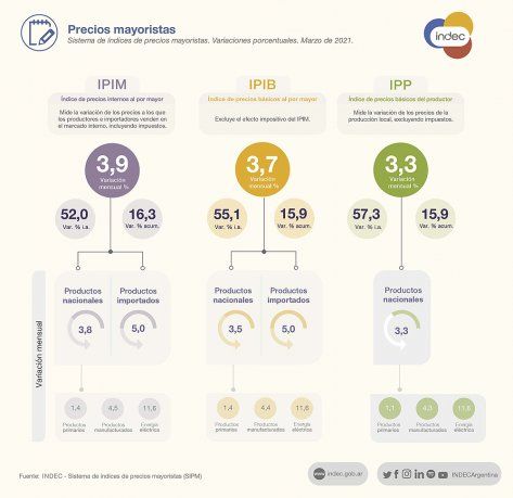 El nivel general del Índice de Precios Internos Básicos al por Mayor (IPIB) mostró en marzo un aumento del 3,7%, comparado con el mes anterior y el indicador de Precios Básicos del Productor (IPP) registró una suba de 3,3% en la misma medición.