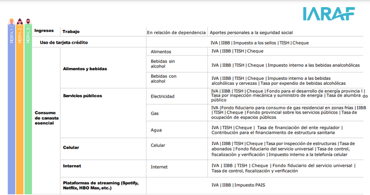 El estudio del Iaraf consideró tres perfiles diferentes, tratando de englobar los distintos comportamientos de los argentinos. El criterio utilizado es el de la existencia del hecho imponible, entendiéndose por hecho a todo aquello que da lugar a la existencia de un tributo para un determinado nivel de gobierno. A modo de ejemplo, para facilitar la comprensión: la compra de alimentos y bebidas (sin alcohol) da lugar a el cobro por parte de los distintos niveles estatales, de por lo menos 4 tributos, como son el IVA e impuesto al cheque a nivel nacional, IIBB a nivel provincial y TISH a nivel municipal.