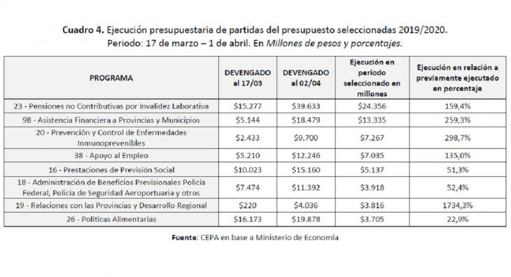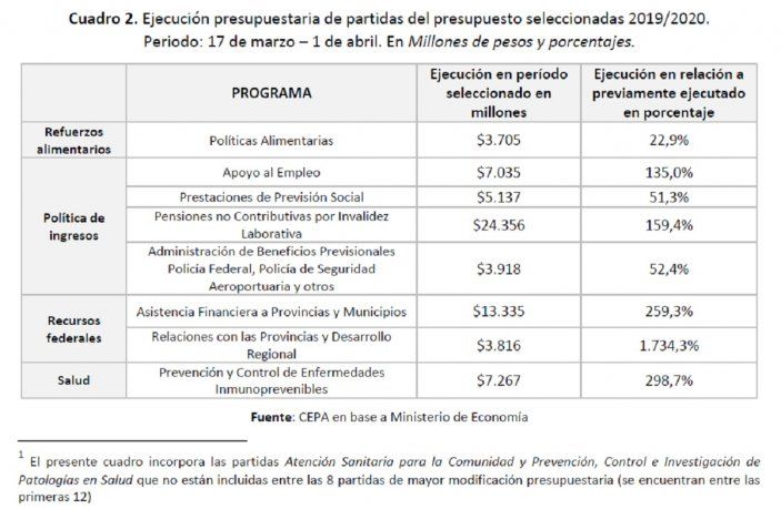 En el lapso que transcurrió desde el 17 de marzo hasta el 2 de abril, hubo 8 partidas que aumentaron de manera significativa, por encima de los $1,5 mil millones. Del total de las partidas que aumentaron en esta segunda mitad de marzo, sólo estas 8 partidas explican el 80% del aumento del gasto. A ello se suma el sensible incremento de la ejecución en un puñado de partidas adicionales. A continuación, se detallan y describen cada una de ellas en el Cuadro 1 y la explicación a continuación del mismo.