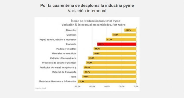 Según un informe de la Confederación Argentina de la Mediana Empresa (CAME), en la comparación mensual la industria pyme perdió un 37%. “Más allá de que hubo empresas con cero actividades, otras sólo vendieron productos que tenían en stock”, explicaron en la entidad.