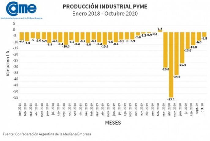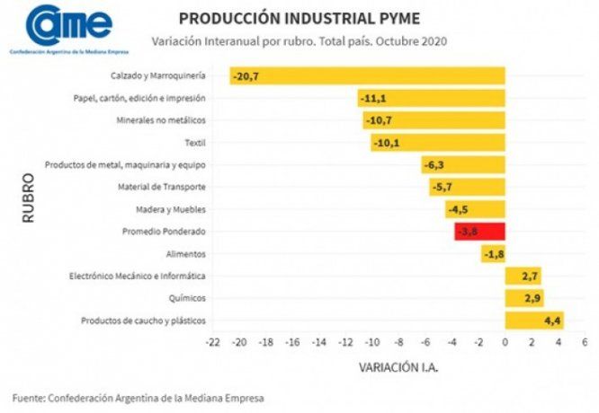 La producción de las pymes industriales cayó 3,8% en octubre 2020 frente a igual mes del año pasado. Tuvo incidencia en ese resultado la falta de insumos en casi todos los sectores que frenaron la elaboración en muchas fábricas. A eso se sumó que las exportaciones no repuntan y el consumo interno todavía se mueve con mucha prudencia, impidiendo ampliar el mercado.