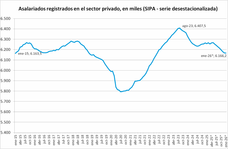 "En la comparación interanual, el poder adquisitivo del salario promedio de convenio registró una caída de 5,9% entre febrero de 2025 y febrero de 2026, mientras que el salario medio proveniente del SIPA evidenció una contracción más leve, de 0,2%", concluye el informe.